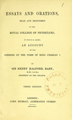 Essays and orations, read and delivered at the Royal College of Physicians; to which is added an account of the opening of the tomb of King Charles I / by Sir Henry Halford.
