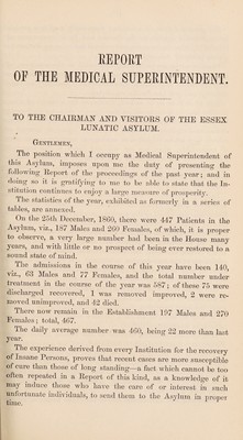 Report of the Committee of Visitors, report of the Medical Superintendent, and other papers relating to the asylum : printed by order of the Court of Quarter Session, 31st December, 1861 / Essex Lunatic Asylum.