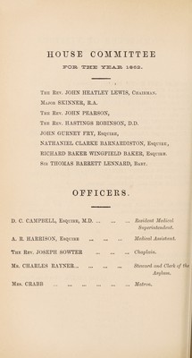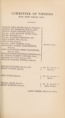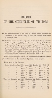 Report of the Committee of Visitors, report of the Medical Superintendent, and other papers relating to the asylum : printed by order of the Court of Quarter Session, 31st December, 1861 / Essex Lunatic Asylum.