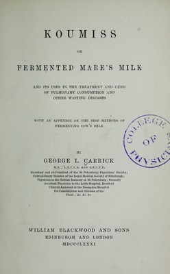 Koumiss, or fermented mare's milk, and its uses in the treatment and cure of pulmonary consumption and other wasting diseases : with an appendix on the best methods of fermenting cow's milk.
