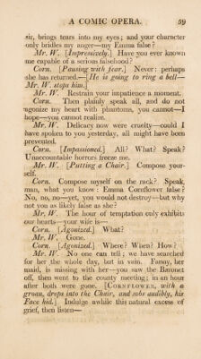 ![Corn, Sir, I hope you have met with no dis¬ appointment to occasion the remark? We are old friends ; and if it is in my power to remedy it, I trust, I needn’t say you may command me. Mr. JV. Command but yourself, and— Corn. Command myself? I don’t understand you. Mr. JV. Y ou have promised yourself much plea¬ sure from presenting this testimony of your affection to Mrs. Cornflower, is it not possible you may be disappointed ? Corn. I think it is not possible : but you shall witness Avhat you seem so strangely to doubt, {Rings the Bell^ Enter Susan. Tell your mistress I wish to see her. Susan. {Embarrassed?^ Sir ? Corn. Tell your mistress I wish to see her. Susan. {Hesitating?] My mistress, sir ? Corn. Yes, your mistress;—is the girl stupid ? Susan. [Williams looking significantly at her?] My mistress is gone out, sir. Corn. Gone out this evening ? Well, we must wait her return. Why didn’t you tell me so at first ? Susan. {Conjused.] Yes, sir. {Exit. Corn. The girl’s a fool. Mr. TV. The absence of Mrs. Cornflower gives me an opportunity for a serious conversation, which an unlucky circumstance prevented yesterday. Corn. On what subject, friend Williams ? Mr. TV. The Baronet, and—and—Mrs, Corn¬ flower. T](https://iiif.wellcomecollection.org/image/b30374790_0067.jp2/full/800%2C/0/default.jpg)