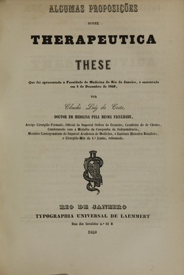 Algumas proposições sobre therapeutica : these que foi apresentada á Faculdade de Medicina do Rio de Janeiro, e sustentada em 3 de dezembro de 1849 / por Claudio Luiz da Costa.
