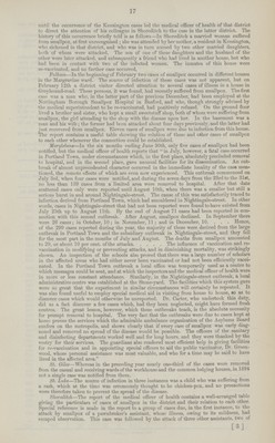 ![15 Smallpox and vaccination. Smallpox caused one death in London in 1889, three in 1890, eight in 1891, 29 in 1892, and 186 in 1893. In 1894 the number of deaths fell to 89. The death rate from smallpox in London in successive periods has been as follows— Smallpox death rate Smallpox death rate Period. per 1,000 living. Period. per 1,000 living. 1851.60 0.28 1891 0.00* 1861-70 0.28 1892 0.01* 1871-80 0.46 1893 0.04* 1881-90 0.14 1894 0.02* The death rate in each year since 184-0 in relation to the mean of the period 1841-94 is shown in diagram IV. During the complete years in which the notification of infectious diseases has been obligatory, the number of cases of smallpox notified to the medical officers of health in London has been as follows— Year. Cases notified. Year. Cases notified. 1890 60 1893 2,815 1891 114 1894 1,193 1892 425 It will thus be seen that the number of cases notified in 1894, although less than 50 per cent, of the number notified in 1893, was yet considerably in excess of the average number of notifications of the period 1890-4. Compared with the large towns in England having more than 200,000 inhabitants. London had in the period 1884-93 a higher death rate from smallpox than any of the towns except Sheffield and AVest Ham, and in 1894 a higher death rate than Leeds, Sheffield, Nottingham, Hull and Salford. Smallpox—Death rates per 1,000 living. Towns. 1884-93. 1894. Towns. 1884-93. 1894. London .07 .02† West Ham .47 .21 Manchester .03 .04 Bristol .03 .07 Liverpool .04 .04 Bradford .06 .12 Birmingham .04 .35 Nottingham .01 .01 Leeds .01 .01 Hull .03 .01 Sheffield .24 .00 Salford .01 .01 In comparing the death rate from smallpox in London with the death rates in the following foreign cities it will be seen that in 1894 the London rate was exceeded by the rates of Paris, Brussels, St. Petersburg and New York, while in 1884-93 it was exceeded by those of Brussels, St. Petersburg, Vienna and Rome. Smallpox—Death rates per 1,000 living. [####]Towns. 1884-93. 1894. Towns. 1884-93. 1894. London .07 02† St. Petersburg .14 .10 Paris .07 .07 Berlin .00 .00 Brussels .18 .04 Vienna .19 .01 Amsterdam .00 .01 Rome .37 .00 Copenhagen .00 .00 New York .03 .08 Stockholm .00 — The cases notified in London were distributed throughout the year as follows— No. of week. Week ending. No. of cases notified. No. of week. Week ending. No. of cases notified. No. of week. Week ending. No. of cases notified. 1 6 January 14 19 12 May 53 37 15 September 20 2 13 15 20 19 „ 32 38 22 ,, 20 3 20 8 21 26 „ 61 39 29 ,, 15 4 27 13 22 2 June 48 40 6 October 13 5 3 February 12 23 9 „ 31 41 13 „ 9 6 10 „ 15 24 16 ,, 39 42 20 „ 8 7 17 „ 16 25 23 „ 19 43 27 „ 8 8 24 „ 18 26 30 „ 15 44 3 November 9 9 3 March 14 27 7 July 28 45 10 ,, 11 10 10 „ 21 28 14 ,, 10 46 17 ,, 3 11 17 „ 7 29 21 „ 13 47 24 ,, 2 12 24 „ 16 30 28 ,, 143 48 1 December 4 13 31 „ 16 31 4 August 58 49 8 „ 9 14 7 April 25 32 11 ,, 22 50 15 ,, 3 15 14 ,, 32 33 18 „ 46 51 22 ,, 3 16 21 „ 41 34 25 „ 27 52 29 ,, 2 17 28 „ 25 35 1 September 51 18 5 May 36 36 8 ,, 14 * See footnote (†), page 7. •† Bee footnote (*), page 8.](https://iiif.wellcomecollection.org/image/b18252436_0025.jp2/full/800%2C/0/default.jpg)