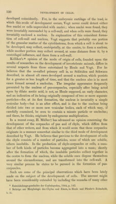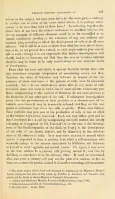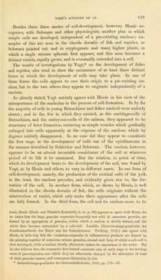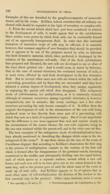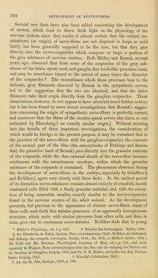 ![DEVELOPMENT OF NEIIVE-FIBRES. Several new Facts have also been added concerning the development of nerves, which tend to throw fresh light on the physiology of the nervous system, since they render it almost certain that the central ter- minations (or origin) of nerve-fibres are not disposed in loops, as until lately has been generally supposed to he the case, hut that they pass directly into the nerve-corpuscles which compose so large a portion of the grey substance of nervous centres. Both Muller and Remak, several years ago, observed that from some of the corpuscles of the grey sub- stance of the brain, spinal cord, and ganglia, fine tooth-like processes issue, and may be sometimes traced to the extent of many times the diameter of the corpuscles.* The resemblance which these processes bear to the delicate, grey filaments observed by Remak in the sympathetic nerves, led to the suggestion that the two are identical, and that the latter filaments take their origin directly from the ganglion corpuscles. These observations, however, do not appear to have attracted much further notice; but it has been found by more recent investigations, that Remak’s sugges- tion concerning the origin of sympathetic nerve-fibres is perfectly correct, and moreover that the fibres of the cerebro-spinal nerves also have, as was indicated by Ehrenberg,f an exactly similar origin.]; Without entering into the details of these important investigations, the consideration of which would be foreign to the present purpose, it may be remarked that in the junction of the nerve-fibres with the ganglion-corpuscles, the contents of the central part of the fibre (the axis-cylinder of Purkinje and Rosen- thal, the primitive hand of Remak) pass directly into the granular contents of the corpuscle, while the fine external sheath of the nerve-fibre becomes continuous with the membranous envelope, within which the granular substance of the corpuscle is contained. The phenomena observed during the development of nerve-fibres in the embryo, especially by Schaffner § and Kolliker, |( agree very closely with these facts. In the earliest period of its formation nerve-suhstance consists almost entirely of roundish, mostly nucleated cells filled with a finely granular material, and, with the excep- tion of being somewhat smaller, exactly similar to the nerve-corpuscles found in the nervous centres of the adult animal. As the development proceeds, but previous to the appearance of distinct nerve-fibres, many of these cells send forth fine tubular processes of an apparently homogeneous structure, which unite with similar processes from other cells, and thus, in time, give rise to continuous nerve-tubules. Kolliker finds that in young * Miiller’s Physiology, vol. i. p. G57. + Stnictur des Seelenorgans. Berlin, 1836. + See Helmholtz, de Fabric. System. Nerv. evertebratorum. 1842 ; Kolliker, die Selbstand. und Abhang. des sympath. nervensyst. Zurich, 1844 ; Dr. Will, in Muller’s Archiv. 1844 ; Dr. Todd and Mr. Bowman, Physiological Anatomy of Man, vol. i. p. 213; and more especially R. Wagner, Neue untersuchungen Uber den Bau und die endigung der Nerven und die Struktur der Ganglion, Leipzig, 1847, and Dr. F. II. Bidder, zur Lehre von dem Nerven- fasern. Leipsig, 1847. § Schmidt’s JahrbUcher, 1847. |] An. des Sc. Nat. Zoologie, 1846, p. 104.](https://iiif.wellcomecollection.org/image/b21967660_0138.jp2/full/800%2C/0/default.jpg)
