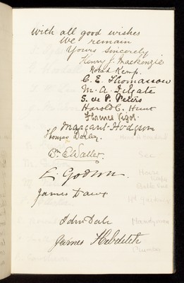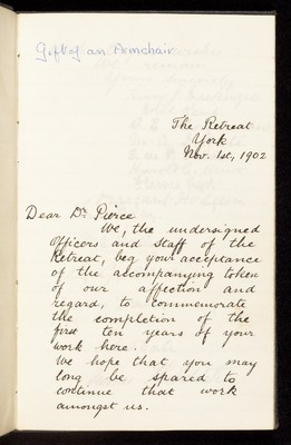 Credit: Small notebook, recording gift of an armchair to Bedford Pierce by officers and staff of Retreat, to commemorate 10 years service, signed by staff, 1 November 1902. Source: Wellcome Collection.