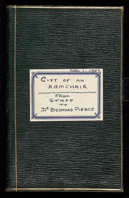 Small notebook, recording gift of an armchair to Bedford Pierce by officers and staff of Retreat, to commemorate 10 years service, signed by staff, 1 November 1902