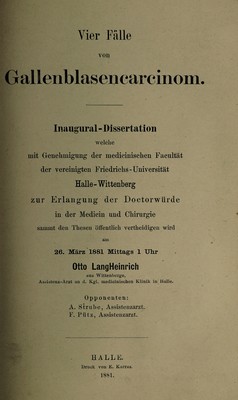 Vier Fälle von Gallenblasencarcinom ... / Otto LangHeinrich.