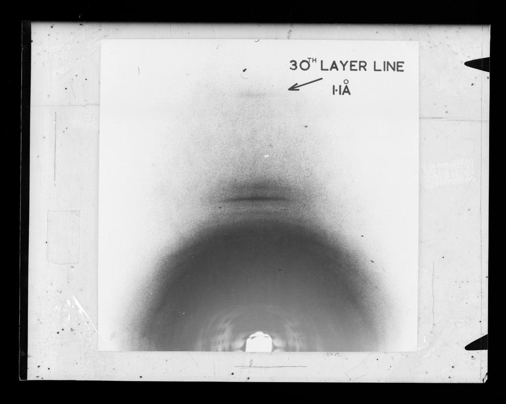 Credit: X-ray diffraction image of B-type DNA referenced as "B pattern 30th layer line". Source: Wellcome Collection.