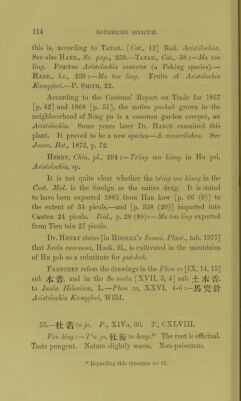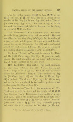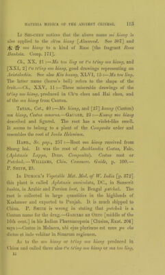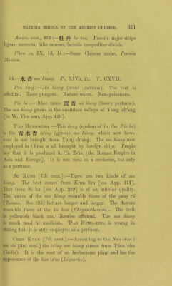 ![Amain, exot., 862 :—^ bo tan. Ppeonia major stirpe ligneo surrecto, folio ramoso, laciniis insequaliter divisis. Phon co, IX, 13, 14 :—Same Chinese name, Paionia Moutan. 54.—7fv ^ mu hiang. P., XlVa, 24. T., CXVII. Pen king:—Mu hiang (wood perfume). The root is officinal. Taste pungent. Nature warm. Non-poisonous. Pie lu :—Other name §|? ^ mi hiang (honey perfume). The mu hiang grows in the mountain valleys of Yung clTang [in W. Yiin nan, App. 426]. T‘ao TIung-king :—This drug (spoken of in the Pie lu) is the pf /fC Ie? tsling (green) mu ldang, which now how- ever is not brought from Yung chking. The mu hiang now employed in China is all brought by foreign ships. People say that it is produced in Ta Ts‘in [the Roman Empire in Asia and Europe]. It is not used as a medicine, but only as a perfume. Su Kung [7th cent.]:—There are two kinds of mu hiang. The best comes from K‘un lun [see App. 171]. That from Si hu [see App. 299] is of an inferior quality. The leaves of the mu hiang resemble those of the yang t‘i jJRumex. See 193] but are longer and larger. The flowers resemble those of the kii hua (Chrysanthemum). The fruit is yellowish black and likewise officinal. The mu hiang is much used in medicine. T£ao Hung-king is wrong in stating that it is only employed as a perfume. Chen Kuan [7th cent.]:—According to the Nan chou i wu chi [3rd cent.] the tsling mu hiang comes from T‘ien elm (India). It is the root of an herbaceous plant and has the appearance of the kau tslao (Liquorice).](https://iiif.wellcomecollection.org/image/b24877104_0121.jp2/full/800%2C/0/default.jpg)