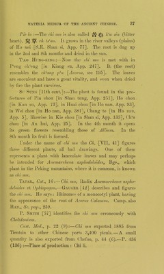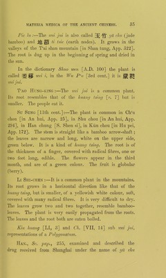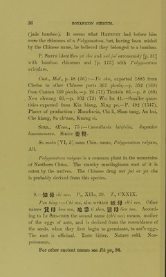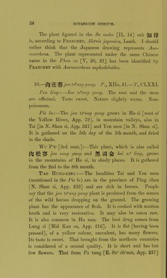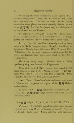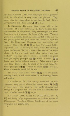 ![ami dried in the sun. The mountain people make a preserve of it for sale which is very sweet and pleasant. They gather also the young plants to use them for food. It is a very palatable dish ; they call it Ifl pi ts‘ai. Li Shi-chen :—The huang tsiug grows wild in the mountains. It is also cultivated. Its leaves resemble bam- boo-leaves but are not pointed. They are arranged in a whorl from three to five around the joints of the stem. The root grows in a horizontal direction, resembles that of the wet jui. The people gather the plant (stem and leaves) to use it for food. The bitter taste disappears after macerating and cooking. This is the lp£ fff ^ pi kuan ts‘ai (pencil-holder vegetable). The Po wu-ehi [3rd cent.] relates the following legend :—Emperor Huang Ti once asked one of his sages whether he knew a plant which when eaten gives im- mortality. The sage replied : There is the plant of the great male (or bright) principle (^ |^) which is called w huang tsing (yellow ethereal essence). When eaten it pro- longs life. There is also the plant of the great female (or dark) principle (>{Cp§i) which is called ${ij kou wen. When it enters the mouth, it kills man. The huang tsing is also called chhii chu (beads hanging down), which name refers to its drooping flowers and berries. An author of the lGtli ceuturv states that its root resembles young ginger, whence the popular name jgjf Ak ye sheng kiang (wild ginger). 1?y partly steaming and drying it is prepared for food and used as a substitute for corn. Another name is mi pu. Kiu huang [LIII, 2] and Ch. [VIII, 13--21, also X, 43] sub huang tsing, representations of various species of Polygonal am. The above Chinese descriptions of the huang tsing agree in a general way. 6](https://iiif.wellcomecollection.org/image/b24877104_0043.jp2/full/800%2C/0/default.jpg)
