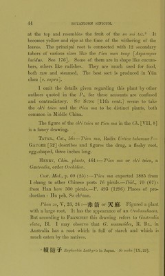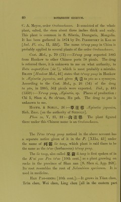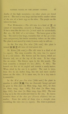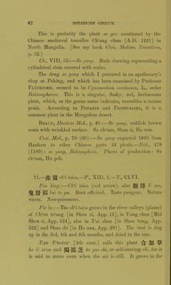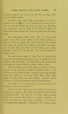 ![and Kien p‘ing [E. Sz£ clffuan and W. Hu pei, App. 139] is of an inferior quality. Su Rung [7tli cent.]:—The drug spoken of by T‘ao IIung-king is the ^ l | tslao (herbaceous) tslung yung, he had not seen the fleshy sort or jou tslung yung. The drug now commonly used in China is the first, of which the flowers have been scraped off. It is less potent than the fleshy kind. Han Pao-sheng [10th cent.]:—The jou ts‘ung yung grows in the Fu lu hien district in Su chou [in Kan su, App. 47, 313], in a sandy soil. In the 3rd and 4th months the people dig up the root, which is more than a foot long, cut out from the centre three or four inches, pass a string through it and dry it in the sun. In the 8th month it is ready for use. The skin (of the plant) is scaly like the cone of a fir. As to the ts^ao (herbaceous) tslung yung it is gathered in the middle of the 4th month. It is from five or six inches to one foot long, has a round stem of a purple (violet) colour. Su Sung [11th cent.]:—The plant is found in all pre- fectures of the province of Shen si [modern Shen si and E. Kan su, App. 284] but this is inferior to the drug brought from the border of Si kffang [N.E. Tibet, App. 300] which is fleshy, thick and more potent. Ancient writers say that it is produced from the semen of the wild horse. Qh. [VII, 17]:—Jou ts‘ung yung. A rude drawing. No inference can be drawn from it. Tatar., Cat., 13 :—-Tslungyung and [04] jou ts‘ung yung, Orobanche preeparata.—-The same drug figured and described in Gauger [51]. He says it is a large tongue - shaped fleshy root covered with scales, in a. salted condition. In 1879 1 procured the same drug at Peking. It was said to bo brought from Mongolia. It proved to be LJhelipad salsa,](https://iiif.wellcomecollection.org/image/b24877104_0049.jp2/full/800%2C/0/default.jpg)
