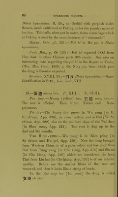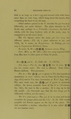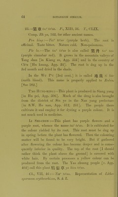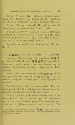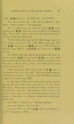 ![22.—wang sun. P., XI15, 35. T., CXXYI. Pen king:— Wang sun. The root is officinal. Taste bitter. Nature uniform. Non-poisonous. Pie lu:—The wang sun, otherwise called ]g|; huang (yellow) sun, ^ liuang hun, grows in Hai si [in Kiang su, App. 50] in river valleys, also near the wall of the city of Ju nan [in Ho nan, App. 110]. Wu P‘h [3rd cent.] says, in ClTu [Hu kuang, App. 21] it is called wang sun, in Ts‘i [N.E. Shan tung, App. 313] ^ is cPang sun or JH hai sun, in Wu [Kiang su, An hui, App. 330] it is Jj] JpL pai hung ts‘ao or ^ $£ man gen. T!ao Hung-king says that in prescriptions the wang sun is also termed j|f huang hun and ^ mou meng. But later authors prove that this is a mistake, for huang hun is the same as the ho huan [Acacia. See 321] and mou meng is the tsz‘ shen [r. 21], Ch‘en TYang-kT [3th cent.] calls it Jp. ^ han ou (Xelumhium root in a dry soil). The root resembles that of Xelumhium speciosum. It grows in the T‘ai Hang mountain range [in N. China, App. 323]. Li Shi-chen :—The leaves of the loang sun are crowded towards the top of the stem as in the tsz' ho chle [Paris. See 151]. These leaves resemble the leaves of the hi hi [Chloranthus. See 42]. The drawing of the axing sun in the Pen ts‘ao hang mu seems to be intended for a Paris, the leaves of this genus, as is known, being whorled at the apex of the stem. Ch., VIII, 3 :— Wang sun. Drawing indistinct. Comp, also Henry, Chin, pi., 320. So moku, VIL, 31, 32:—Paris quadrifolia, L., and P. tetraphylla, A. Gray.](https://iiif.wellcomecollection.org/image/b24877104_0073.jp2/full/800%2C/0/default.jpg)