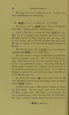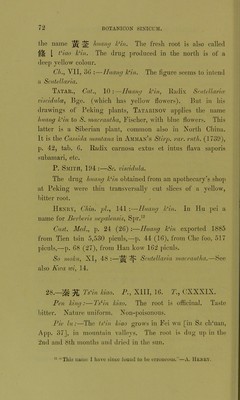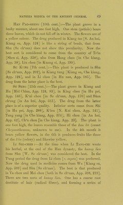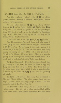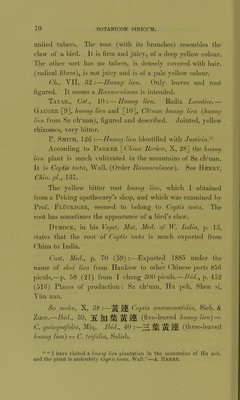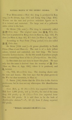 ![Han Pao-sheng [10th cent.]:—The plant grows in a bushy manner, about one foot high. One stem (petiole) bears three leaves, which do not fall off in winter. The flowers are of a yellow colour. The drug produced in Kiang tso [S. An hui, Iviang su, App. 124] is like a string of beads, that from Shu (Sz ch‘uan) does not show this peculiarity. Now the best sort is considered to come from the country of Ts‘in [Shen si, App. 358], also from Hang cliou [in Che kiang, App. 58], Liu cliou [in Kuang si, App. 199]. Su KuNG [7th cent.]:—This plant is produced in Shu [Sz clffuan, App. 292], in Kiang tung [Kiang su, Che kiang, App. 124], and in Li chou [in Hu nan, App. 185]. The drug from the latter place is the best. Su Sung [11th cent.]:—The plant grows in Kiang and Hu [Mid China, App. 124, 83], in King chou [in Hu pei, App. 146], K‘ui chou [in Sz elduan, App. 170] and Siiau ch‘eng [in An hui, App. 315]. The drug from the latter place is of a superior quality. Inferior sorts come from Shi [in Hu pei, App. 288], Iv‘ien [N. Kui chou, App. 141], Tung yang [in Chekiang, App. 376], Hi chou [in An hui, App. 62], Ch‘u chou [in Che kiang, App. 23]. The plant is one foot high, the leaves resemble those of the kan kit (sweet Chrysanthemum, unknown to me). In the 4th month it bears yellow flowers, in the 6th it produces fruits like those of the Cm (celery) and likewise yellow. Li Shi-chen :—At the time when Li Tang-chi wrote his herbal, at the end of the Han dynasty, the huang lien from Shu [W. Sz chffian] was considered the best. In the T‘ang period the drug from Li chou [r. supra'] was preferred. Now the drug used in medicine comes from Wu [Kiang su, App. 389] and Shu [Sz ch‘uan]. The best is that produced in Ya chou and Mei chou [both in Sz ch'uan, App. 398, 219]. There are two sorts of huang lien. One has a coarse root destitute of hair (radical fibres), and forming a series of](https://iiif.wellcomecollection.org/image/b24877104_0079.jp2/full/800%2C/0/default.jpg)