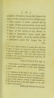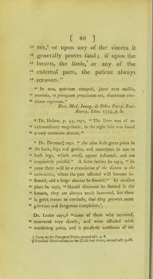 ![[ *0 ] tc ver,8 or upon any of the viscera it “ generally proves fatal; if upon the “ breasts, the limbs/ or any of the “ external parts, the patient always “ recovers.” t( In una, quantum compcri, jecur erat mollis, “ enormis, et postquam perscissum esf, abscessum con- t( tinere repertum.” Diss. Med. hieing, ele Fell re Puerp. Patr. Kcary. Edin, 1774,/. 8. 3 Dr. Hulme, p. 43, says, <c The liver was of an <£ extraordinary magnitude; in the right lobe was found <f a very extensive abscess.’* 9 Dr, Denman]; says tf she also feels great pains in <( the back, hips and groins, and sometimes in one or <c both legs, which swell, appear inflamed, and are t( exquisitely painful.” A little farther he says, “ In <c some there will be a translation of the disease to the sc extremities, where the part affected will become in- (t flamed, and a large abscess be formed.” In another (s place he says, tf Should abscesses be formed in the <( breasts, they are always much lamented, but there “ is great reason to conclude, that they prevent more f( grievous and dangerous complaints.’{ Dr. Leake says,+ « some of those who survived, u recovered very slowly, and were affected with fC wandering pains, and a paralytic numbness of the + Essay on the Pueiperal Fever, second edit. p. 9.](https://iiif.wellcomecollection.org/image/b21522601_0056.jp2/full/800%2C/0/default.jpg)