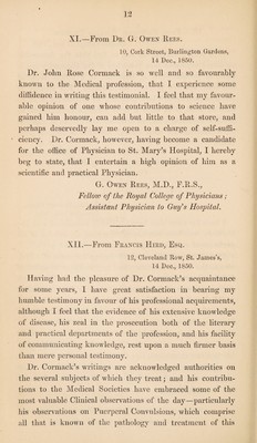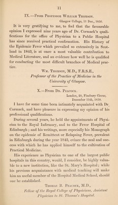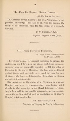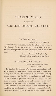 Testimonials submitted to a Committee of the Governors of St. Mary's Hospital, [and, Letter of application for the post of Physician] / by John Rose Cormack.