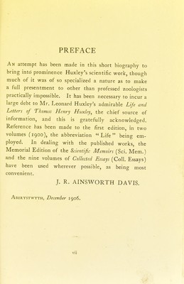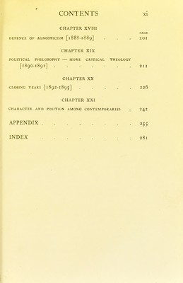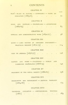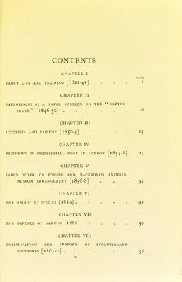 ![CHAPTER I EARLY LIFE AND TRAINING [l 82 5-45] CHAPTER II EXPERIENCES AS A NAVAL SURGEON ON THE RATTLE- SNAKE [1846-50] CHAPTER III SUCCESSES AND FAILURE [185O-4] . . . . CHAPTER IV BEGINNING OF PROFESSORIAL WORK IN LONDON [1854-8] CHAPTER V EARLY WORK ON FOSSILS AND BACKBONED ANIMALS. MUSEUM ARRANGEMENT [1856-8] . . CHAPTER VI THE ORIGIN OF SPECIES [1859] . . . . . CHAPTER VII THE DEFENCE OF DARWIN [1860] . . . . CHAPTER VIII DISSEMINATION AND SUPPORT OF EVOLUTIONARY DOCTRINES [1861-2] ......](https://iiif.wellcomecollection.org/image/b21982740_0017.jp2/full/800%2C/0/default.jpg)