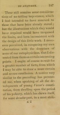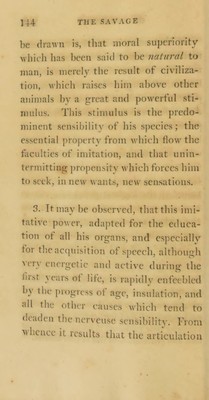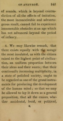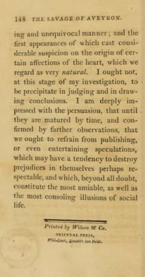 ![]4S THE SAVAGE OF AVEYRON. ing and unequivocal manner ; and the first appearances of which cast consi- derable suspicion on the origin of cer- tain affections of the heart, which wre regard as very natural. I ought not, at this stage of my investigation, to be precipitate in judging and in draw- ing conclusions. I am deeply im- pressed with the persuasion, that until . they are matured by time, and con- firmed by farther observations, that we ought to refrain from publishing, or even entertaining speculations, which may have a tendency to destroy prejudices in themselves perhaps re- spectable, and which, beyond all doubt, constitute the most amiable, as well as the most consoling illusions of social life. Printed by Wilson tsf Co. oriental press, Mid-Court, Unwin's inn Fields.](https://iiif.wellcomecollection.org/image/b28747379_0156.jp2/full/800%2C/0/default.jpg)