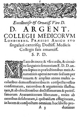M0016102: Dedication of William Harvey's De motu cordis to Dr Argent, 1628