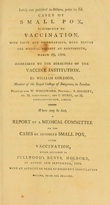 Some recent cases of small pox subsequent to vaccination. To which are added, experiments to ascertain the effect of vaccinating in the hand in imitation of the casual disease ; with facts, and observations on the effect of eruptive diseases in removing the security derived from cow pox / [William Goldson].