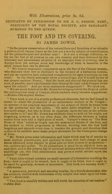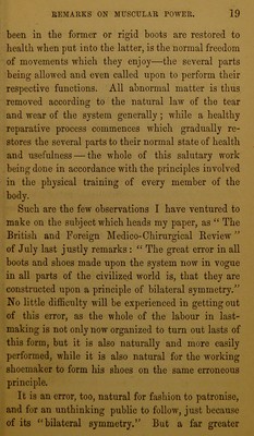 Remarks on the loss of muscular power arising from the ordinary foot-clothing now worn, and on the means required to obviate this loss : being a paper read before the British Association at Cambridge, October, 1862 / by James Dowie.