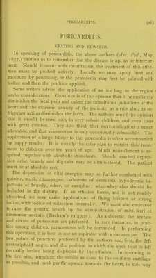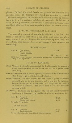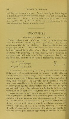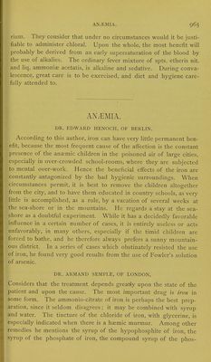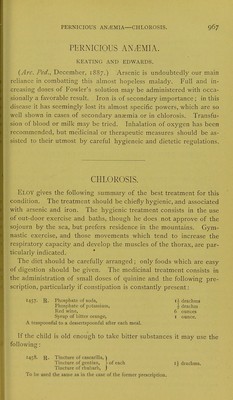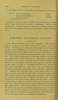 ![For the improvement of digestion the following may be employed : HS9- R- Dilute hydrochloric acid, Syrup of bitter orange peel, Tincture of bitter orange peel, Infusion of cascarilla, A teaspoonful after each meal. In the use of the iron salts, he prefers the lactate of iron in small doses, being careful not to produce constipation. Arsenic, when administered, should be given in small doses, carefully watching it, that it does not produce irritation of the kidneys or gastro-intestinal tract. HEMOPHILIA (HEMORRHAGIC DIATHESIS\ A. JACOBI, M. D. This eminent physician {Arch. Fed., November, 1888,) believes that the treatment of this grave affection is to a great extent pre- ventive. He thinks that a depraved social condition of a large pro- portion of our inhabitants is to answer for the majority of cases. Zymotic disorders and eruptive fevers must be treated with the vie~ of sustaining the strength of the system and the vigor of the circula- tion. The heart's action must be constantly watched, and cardiac tonics given before heart failure sets in. The dietetic treatment of; this disease is at least as important as^ the medical management. Medicines can accomplish a great deal, but ergot less than it is often credited with. It must be remembered that this drug frequently plays havoc with digestion. Iron also is not to be relied upon; among its preparations the tincture of the chloride is probably the best. Digitalis has a favorable effect on the heart's action; an in-] fant of one year, may take the equivalent of from one to four grains. daily for some days, and two grains daily afterwards. With it, may be combined strychnia, about a fiftieth of a grain daily. For the invigoration of the blood vessels, which is the main object, from one ! to th ree drops of Fowler's solution may be given every day for a long time. This drug should be largely diluted with water before being administered. Better still is phosphorus, in very small doses. The author says that he is much dissatisfied with the use of lead and tannin. Local hemorrhages must be treated by applications of ice and compression. Dr. JACOBI emphasizes the point that the suc- cessful preventive treatment, is largely a social question. 15 drops 1 ounce 1 drachm 22 ounces.](https://iiif.wellcomecollection.org/image/b20413890_001_0984.jp2/full/800%2C/0/default.jpg)