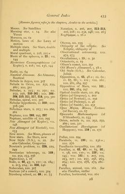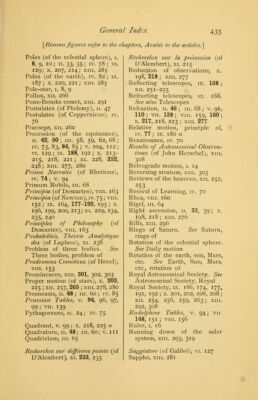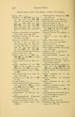 ![[Roman figures refer to the chapters Arabic to the articles.] Saros, i. 17 ; n. 43 Satellites, vi. 121, 127, 129, 133 ; vii. 145, 150; viii. 154, 160, 162; ix. 170, 183-185; x. 210, 216; xi. 228, 248; xii. 253, 255, 267; xm. 272, 283, 295, 296, 297, 318, 320. See also Jupiter, Saturn, etc., satellites of Satellites, direction of revolution of, xi. 250; xm. 295, 318 Satellites, rotation of, xi. 250; xii. 267 ; xin. 297 Saturn, 1. 14-16; 11. 25, 51; iv. 81, 87; v. 99; vi. 123; VII. 1367*, 142, 144; viii. 154, 156; ix. 183, 185, 186; x. 204; XI. 228, 231, 235, 236, 243-246; xii. 253, 267; xm. 288, 297. See also the following headings Saturn, mass of, ix. 185 Saturn, rings of, vi. 123; viii. 154, 160; xi. 228, 248 ; xn. 267; xm. 295, 297 Saturn, rotation of, xn. 267 ; xm. 297 Saturn, satellites of, vm. 154, 160 ; ix. 184 ; xi. 228 ; xn. 253, 255, 267 ; xm. 295, 297, 307 Scientific method, 11. 54 ; vi. 134 ; ix. 195 Seas (on the moon), vi. 119; vm. 153; xm. 296 Seasons, 1. 3; 11. 35, 39; iv. 82; xi. 245 Second (angle), 1. 7 Secular acceleration of the moon's mean motion, x. 201 ; xi. 233, 234, 240, 242 ; xm. 287 Secular inequalities. See In- equalities, secular Sclenographia (of Hevel), vm. 153 Selenotopographische Fragmente (of Schroeter), xn. 271 Sequences, method of, xn. 266 Shadow of earth, moon. See Eclipses Shining-fluid theory, xn. 260; xm. 310, 311 Shooting stars. See Meteors Short-period comets, xm. 291 Sidereal month, 11. 40 Sidereal period, iv. 86, 87 Sidereal system, structure of, xn. 257, 258, 259-262; xm. 317 Sidereal year, 11. 42 Sidereus Nuncius (of Galilei), vi. 119-122 Sights,' v. no; vm. 155 x. 198 Signs of the zodiac, 1. 13 Sine, 11. 47 11; in. 59 n, 68 n Sirius, xm. 316 n Solar eclipse. See Eclipse Solar system, stability of, xi. 245 ; xm. 288, 293 Solstices, 1. 11; 11. 36, 39, 42 Solstitial points, 1. 11 Space-penetrating power, xn. 258 Spanish astronomy, m. 61, 66 Spectroscope, xm. 299. See also Spectrum analysis Spectrum, spectrum analysis, ix. 168; xm. 273, 299-302, 303, 304, 306, 309, 311-314, 317, 318 Sphacra Mundi (of Sacrobosco), in. 67 Sphere, attraction of, ix. 173, 182; xi. 228 Sphere, celestial. See Celestial sphere Sphere, doctrine of the. See Spherics Spheres, celestial, crystal. See Celestial spheres Spheres, music of the, 11. 23; vn. 144 Spherical form of the earth, moon. See Earth, Moon, shape of Spherics, 11. 33, 34 Spica, 11. 42 Spiral nebulae, xm. 310 Stability of the solar system, xi. 245 ; xm. 288, 293](https://iiif.wellcomecollection.org/image/b21033870_0528.jp2/full/800%2C/0/default.jpg)