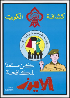 A map of Kuwait in the national colours of red, black, green and white with silhouette black figures of men, women and children within a circle bordered at the top by Arabic script: the logo for the Kuwait National AIDS Committee; within a blue backdrop containing a boy dressed in a brown uniform with a cap representing a warning about AIDS in Kuwait. Colour lithograph, 1990.