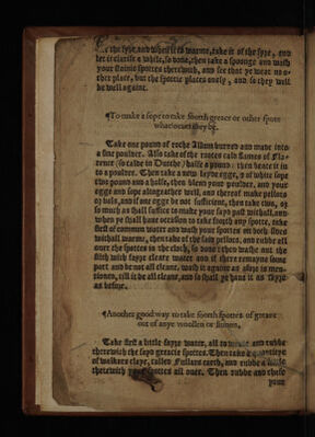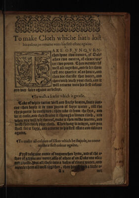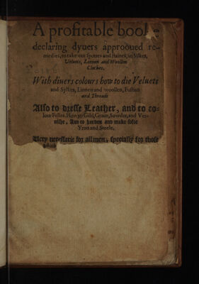 Credit: A profitable booke declaring dyvers approoved remedies, to take out spottes and staines, in silkes, velvets, linnen and woollen clothes. With divers colours how to die velvets and sylkes, linnen and woolen, fustian and threade. Also to dresse leather, and to colour felles. How to gild, grave, sowder and vernishe. And to harden and make softe yron and steele ... / [Leonard Mascall]. Source: Wellcome Collection.