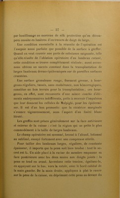 ![Iraiichant ; enlamez-la franchement dans la moitié de son épaisseur environ et, suivant des yeux la marche du tran- chant, maintenant la position constante de la lame, continuez l’entaille en descendant, dans la couche superticielle, par un rapide mouvement de va-et-vient en archet. Quand on en a l’habitude, la vitesse devient, en quelque sorte, une condition de la régularité et de runiformité des lambeaux ainsi obtenus. Si la greffe est bien taillée, un ruban ayant partout la même largeur, — un travers de pouce environ, — finement dentelé, non opaque, blanc rosé, se ramasse par plis réguliers sur la lame; au fur et à mesure, la main gauche, qui tend la peau, se recule, pour maintenir une tension égale, devant la marche du rasoir ; on arrête le lambeau à la longueur convenable, en relevant d’un coup net le tranchant appuyé sur le pouce. On peut arriver à tailler des lanières, d’une belle régularité, de 15 à 25 centimètres. Sur la surface ainsi rasée se produit un pointillé sanguin, correspondant à la section des pupilles, et indiquant que la taille s’est faite à la profondeur requise; les lambeaux de Thiersch sont formés, en effet, de la couche épidermique et]de la couche superficielle papillaire du derme. Dans le service de Thiersch nous avons vu les aides se par- tager en deux équipes dont l’une préposée à la taille des lam- beaux, et l’autre, chargée de leur mise en place; c’est un moyen d’accélérer la besogne. Les lanières sont portées par glissement sur une large spatule coudée.,. La spatule chargée est approchée du bord de la plaie par son extrémité, et tenue rigoureusement parallèle à la surface à couvrir ; le placement des lanières va se faire suivant le grand axe de cette sur- face. Fixez avec une sonde cannelée le bord du lambeau sur la marge même de la place, et, d’un mouvement régulier, éloignez](https://iiif.wellcomecollection.org/image/b22403280_0060.jp2/full/800%2C/0/default.jpg)