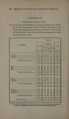 ![APPENDIX D. STATISTICAL TABLES.—No. I. TaBLe showing the Numbers of the Insane admitted into Public and Private Asylums and Lunatic Wards of Poorhouses; the Numbers discharged therefrom Recovered and Not Recovered ; Numbers. Discharged. MONTHS. Admitted. t ered. Recovered. sere January, dsb lsb abe cok SOCRERROCN TC an eNekte? Pabruary j cc: ..0t 0 ais ses coe se sdaehsane ee acer Marchy) icons cosoastos sin tetnss Sar akewcebas tote Total in First Quarter,......... 169} 220} 67 1 Aico end vue Soenie tn DAWN, i craahg honer pease ra dteacc Sea nctehaneresnt ts Total in Second Quarter,...... A USUB,; ss knee ageest5h can bee oes darludounsvan niet OD LCLIDOE, uc. sswascaes onouns tadaecepevencks ate Total in Third Quarter, ...... OOS cumin abt des dai pea tueenasesncinten senate Teron Gell INGWemberocehrcccs caruttechaelenttacsse ese toees end = BOLE Ol) O27 December nvcni ie. ssnsis cas'exe sii stansererees corte’ GS! © G4 = ——— | | | | | fh a Total in Fourth Quarter,...... 187] 186] 69 GENERAL OPAG, Risin vicsd ces cee 769 897] 290} 379)*181/*268 * Of the patients discharged not recovered, 58 males and 95 females were transferred to other establishments, and are included in the numbers of admissions.](https://iiif.wellcomecollection.org/image/b31856226_0252.jp2/full/800%2C/0/default.jpg)