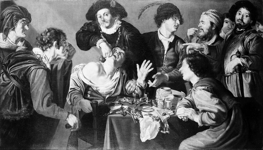 Credit: M0018049: A troupe of travelling performers including a toothdrawer, oil painting. Source: Wellcome Collection.