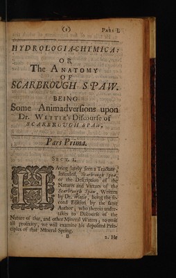 Credit: Hydrologia chymica: or, the chymical anatomy of the Scarbrough, and other spaws in York-shire. Wherein are interspersed, some animadversions upon Dr. Wittie's lately published treatise of the Scarbrough-spaw. Also, a short description of the spaws at Malton and Knarsbrough. And a discourse concerning the original of hot springs ... with the causes and cures of ... diseases ... Also, a vindication of chymical physick ... Lastly ... an appendix of the original of springs; with the author's ternary of medicines; and the epilogue ... of the essence of the Scarbrough-Spaw / [W. Simpson]. Source: Wellcome Collection.