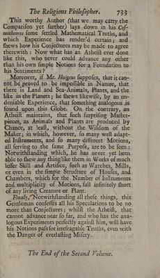 The religious philosopher, or, the right use of contemplating the works of the Creator / ... Designed for the conviction of atheists and infidels ... by that learned mathematician Dr. Nieuwentyt ; Translated from the original by John Chamberlayne ... To which is prefix'd, a letter to the translator, by the Reverend J.T. Desaguliers. Adorned with cuts.