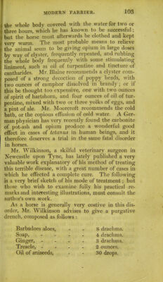 The modern farrier, or, The art of preserving the health and curing the diseases of horses, dogs, oxen, cows, sheep, & swine : comprehending a great variety of original and approved recipes, instructions in hunting, shooting, coursing, racing, and fishing, and a summary of the game laws; with an enlivening selection of the most interesting sporting anecdotes : the whole forming an invaluable and useful companion to all persons concerned in the breeding and managing of domestic animals / by A. Lawson ... ; illustrated with numerous engravings.