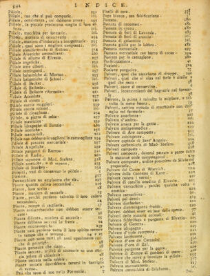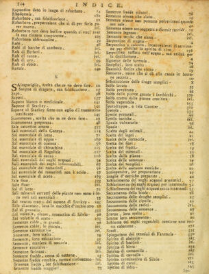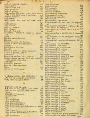 ![Goccîe amars. , ^ Goccie anodine cl’Inghiiterra. Goccie cefjliche d’ I-ighi terra Goccie d’uro, esame del e. Goccie d’oro del General délia Motte. Goccie di Talbor.. Grano di Scar/affo ► Grano di chernries . Grani di panacea. Grani di vita . Grassi, lor préparai ione . Grasso, perche divien rancido . Grasso di tasso, sua falsificazione . Grasso di porco . Grasso di orso , sua falsificazione . Giulebbi, Giglio di paracsiso .. Gusci di ova preparatî . Giisci di îeiüne di mare preparatî. Girasole contiene del saie alcaPi fisso . Girasole, grande contiene molto di nitro. H fera djaco/ocynîhidos. Fî era piera . I IMpalpablle , polvere., Itnpregnare. Indinazione'.. Jncinerazione, l'ncorporare ^ Indfgene, piante ^ Infusion!. Infusione decozione , che sia ,, Injezioni . întcrmedio.. Ipecacuana , modo di ridurla in polvere. Lniroduzione alla FaTnacia . Istoria narurale ,, difticoltà di studiarla .. Istoria iiaturale , divisione délia . Tjtrnmenti e vasi . Imbiancbire i, fruLti prima di cuocergli ». Lmbalsamento . indorar le pillole - idromele semplice . K K .Errres minérale, per la via umida L LAtte di mandorîe , o emulsione . Latte vergina'e ,i Lavamento delle materie prima di.trifarle Lavaniento delle terre . Lauclano iiquido di Sydenham Laudano cppiato. Lavamenti Lise:va del sapona],. Legni , loro scelta .. Legnosanto . Legni sudorifici , Liniatura di ferro , sua scelta'^. Limatura di ferro polverizzata. Limatura di ferro si polv.erizza ne.l mortajo . Limonata arridziale . 89 ivi. ivi. ço ivi. 127 129 64 ivi. 10 64 11 524 94 44 ivi. SS ivi. 237 ivi. • • IV). ivi. ivi. • • ivt. ivi. 32s 74 59 I 7 215 551 254 178 5'^ 19s 3-J2 44 45 85 106 527 118 21 515 552 42 ivi. ivi. 24.4 Lbncnata secca. Linirnenii . Linimemto contre la paralîsia, Liquefare . Liquor melato . Lltargirio preparato. Lûochi. Looch bianco pettcrale. I.ooch di rosso di ovo. Looch , spezie di trementinsT. Looch verde. Lavamenti e doccie . Lavamento délia trementina . Licopodio. Licopodio arresta il sudore Lambicco a bagno-maria . M MAcerare . Mascelle di luccio , lor ne. Miicelle di luccio porfirizzate . Maddaléoni. Maddaleoni, maniera di formargli. 297 Maddaléoni di empiastri . ivi. Magma. ^ Manna, sue diverse spezie. n Manna , sua falsificazione . ivi. IVlanna in iagrirna fatticcia . ivi. Marmellata di Albicoche. 212 Masticatorj . ^ ^ Materie acriaccident! che cagionano ne! pe- starle, . ^ g7 Materia medica che sia. 7 Materia medica, sua divisione. 8 Matraccio. 5^2 Médicament!, lor divisione. 7 Médicament i semplici , luogo dove si raccolgo- no , e loro scelta . 15 Medicamenti esterni. ^ i-?7 Medicamenti magisrsrli che siano. 32L Medicamenti cfîicinali che siano . 7^ Medicamenti che preparansi col mele è zucche- . ro. • . . , . . . . '7^ Medicamenti semplici che si meschiano insieme ivh ?27 552 185 4> 222 ivi. 525 322 525 5^7 66 IV!. 4 552 porfirizzazio- 42 .45 552 e chiamansi colletiivamente. Melazzo . Mestruo. Mercurio, od srgehrovivo falsihcato. Mercurio non pua separarsi dal grasso, si faccia liquefar l’unguento. Mercurio purificato. Nercurio si corTibina male colle materie -vegeiabiü. Merda di Maria Graillon . Merda del Principe dl Oranges . Misure . ^ , , '/ Misure di moll’ingred îenti indicate con abbre- viature * Mele, scelta che si deve tarne per gli Cier- tua?j. . Meli, riconoscer la loro cuocitura . 179 Mer.; rilevar la lor cottvra col pesaliquore .. ivi. Meli composti, ^ ^ 7S> 185 1 benchè 295 5^ oleose 294» ivi.](https://iiif.wellcomecollection.org/image/b22038188_0359.jp2/full/800%2C/0/default.jpg)