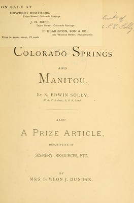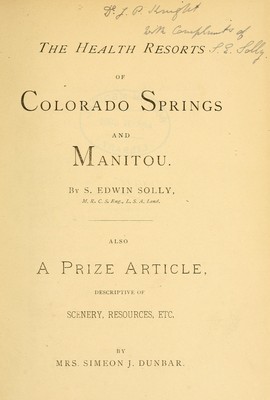 The health resorts of Colorado Springs and Manitou / by S. Edwin Solly ; also a prize article, descriptive of scenery, resources, etc. by Mrs. Simeon J. Dunbar.