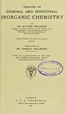 Treatise on general and industrial inorganic chemistry / by Etore Molinari ; third revised and amplified Italian edition translated by Ernest Feilman.