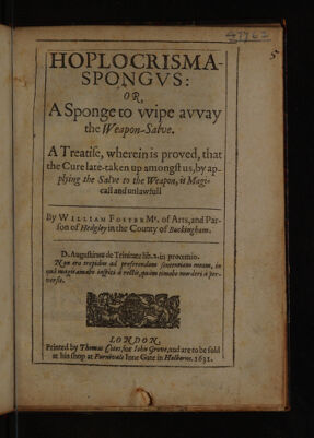 Hoplocrisma-spongus: or, A sponge to wipe away the weapon-salve. A treatise, wherein it is proved, that the cure late-taken up amongst us, by applying the salve to the weapon, is magicall and unlawfull ... / [William Foster].