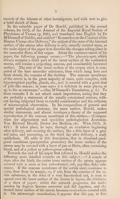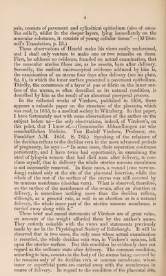 ![INTERNAL SURFACE OF THE UTERUS AFTER DELIVERY. By J. MATTHEWS DUNCAN, M.D., F.R.C.P.E., LECTURER ON MIDWIFERY, ETC., ETC. [REPRINTED FROM THE EDINBURGH MEDICAL JOURNAL, DECEMBER 1857.] It must appear astonishing to all who reflect on the recent extra¬ ordinary advances of physiological and pathological anatomy, that a subject so immensely important, in relation to health and disease, as the condition of the internal surface of the uterus after delivery, should have so long remained in its present condition of imperfect description. This state of matters cannot be the result of any extraordinary difficulty in the subject; it may, indeed, with more reason be ascribed to the want of such difficulties as excite the generous emulation of the pursuers of science. In the early part of the year 1853, I presented to the Physio¬ logical Society of Edinburgh, a communication on this subject (see Monthly Journal of Medical Science for September 1853), and, sub¬ sequently, in the same year, published an article in the British and Foreign Medico-Cliirurgical Review (No. for October, p. 506), en¬ titled, u The Internal Surface of the Uterus after Delivery ; its Analogies,” etc. The views enunciated in that paper were entirely at variance with those generally taught in this and other countries. Since its publication, little progress has been made. The present short article is written in order to lay before the profession the most recent state of the subject. It will also serve to rectify the mistakes of some authors who have erroneously interpreted my views, and to sweep away the ill-concealed ingenuity of others, who have tried to amalgamate them with the old hypothetical notions, and to entangle them in the support of erroneous pathological doctrines. In the paper referred to, I remarked that, in the history gene¬ rally, if not universally, given, of the termination of parturition and the restoration of the inner surface of the uterus to its pristine](https://iiif.wellcomecollection.org/image/b30563331_0001.jp2/full/800%2C/0/default.jpg)