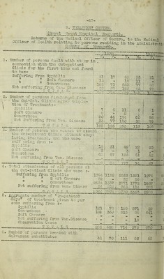 ![2. TliSATMENl1 CENTRE. .1 Royal Gwent Hospital Novroort). __ Hoturns of the Modi cal Officer of CCentro, to tho Modi col Ollioor of health rolating to porsons residing in tho Administrate County of Monmouth. . ■ • . • r. 1. Numb or of persons dealt with at or in . ~ T ! '■ ;—“ connect ion with tho Out«p.ationt S * j Clinic for tho first timo and found! j to bos- r I Suffering Prom Syphilis ” M Soft Chancre v * n Gonorrhoea, Not suffering: from Von. Dianasos m n. Ti a , r 2. Number of persons discharged from •' tho.. Out-Pat. Clinic; yftor coup lo- ti on of Tree.fenion1?** syp Soft Ghancro Gonorrhoea Not Suffering from Von, Disease TOTALS 5. ** •***’•»- K*+*m4*~ 4 tho Cu t “P at iont Clinic ./iihcut comp4* loting troctiaont, and who wore suff oring from j- 31 17 40 :• 35 : i—J . CV2 15 - 15 11 ! 162 71 2338 • 77 ! 68 ! 59 87 126. 45 1 97; ’ ;J O i ''7 **•'■**'• * >«-*•»•* •cA'.r W .« — • : 7 ■ 4 11 i \ I - t 6 j • . i '• C 1 : •8 r 8 1 i '• %/ i * ‘80 44 124 ! eo 26 1 33 77 110 j 30 1 79 t 128 125 253; 113 : 106 bond -- - j - . • - ■ - - im Syphilis Soft Chancro Gonorrhoea .T 0 T A I 4. Total attondancos of all persons at \ i 18| 31j 49 : 22 . 25 3 1 - ! '31 1 ! 68 | -57 ! 125: 51 42 ! 3)1 sea so _ - g- *9 T» n O , .■OC] ’ i OQ'i -3- ' 1- r igaSini 177 -jzaJ.: • -67 J.— c • )cr Aggro gat o ■ numbo r of In~p a tio nt days” of treatment given to po sons suffering from Syphilis Gonorrhoea _« Soft Chancre Not suffering from Von.Disease Observation Cases Syphilis .1354 11159 ! 2553'1391 : 1274 : 2( S oft Chancre : ■ 52 i - 1 52'; 66 r ’ -i fe Gonorrhoea- .12434 [1537 ; 3771 1772 i 1027'j 21 ; from Yen. Din a so I 64 i -239 j • 363: 114 1 285 CL 3L L JL. _ _gj)44 12795 1 ’07.30 3343 ! 2586 5; 121 j 70 199 | 271 j £9 165 ! 350 !• 515 * 04 $ 641 < _ TX T. A L « 6. Number of persons treated-with Salvorsan substitutes -* * i j ape ! <C0>O : 428! 714 373 • 670 1 . . • V ' ! 41 j i \ i 7-0-j 111 | 62' | 69 :](https://iiif.wellcomecollection.org/image/b28861607_0020.jp2/full/800%2C/0/default.jpg)