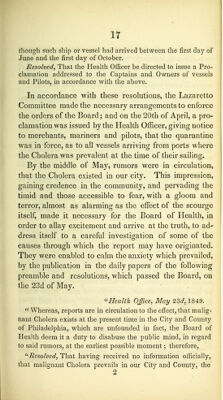 Statistics of cholera : with the sanitary measures adopted by the Board of Health prior to, and during the prevalence of the epidemic in Philadelphia, in the summer of 1849, chronologically arranged / prepared by the Sanitary Committee, approved by the Board, and ordered for publication, October 10th, 1849.