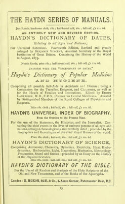 Haydn's dictionary of popular medicine and hygiene : comprising all possible self-aids in accidents and disease being a companion for the traveller, emigrant, and clergyman as well as for the heads of all families and institutions / edited by Edwin Lankester ; assisted by distinguished members of the Royal Colleges of Physicians and Surgeons.