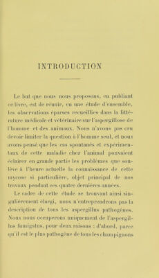 ![INTRODUCTION Lo but que nous nous projiosous, eu ])ul)liaiit ce est de réuuir, eu uik‘ étude d’iMisiuuble, l('s observations éparses recueillies dans la litté- i“ature médicale et vétérinaire sur l’aspergillose d(‘ rhoimiK' et des animaux. Nous n’avons pas cru (b'voir limiter la (jiiestiou à l’bomim' seul, et nous avons pensé tpie les cas spontanés et exjiérimeu- taux de cidte maladie' chez ranimai pouvaient é(‘lair<‘r eu grande partie' h's preiblèmes epie seiu- lève' à l’heure actuelle la comiaissaiice ele cette mycose; si jiarticulière, objet principal de mis travaux penelant ce's epiatre dernières années. Le cadre eh' cette étude se trouvant ainsi sin- gulière'inent élargi, nous n’entreprendrons ]>as la elescription ele tems les aspergillus palhogènes. Nous nous eiccupe'rons uni([ue'inent ele l’aspergil- his fumigatus, peiur eh'ux raisons : el’aliorel, [larce epi’il e'st le plus jiathogène ele' tous les ediampignons](https://iiif.wellcomecollection.org/image/b21729001_0013.jp2/full/800%2C/0/default.jpg)