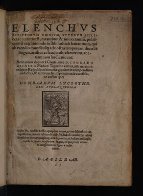 Elenchus scriptorum omnium, veterum scilicet ac recentiorum, extantium et non extantium, publicatorum atque hinc unde in bibliothecis latitantium, qui ... usque ad nostra tempora in diversis linguis, artibus ac facultatibus, claruerunt, ac etiamnum hodie vivunt: ante annos aliquot ... / editus, nunc vero primum ... in compendium redactus, et ... auctus: per Conradum Lycosthenem.