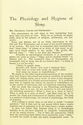 The physiology and hygiene of sleep : bring the annual public lecture on "The laws of health" delivered at the Midland Institute, Birmingham, September 16, 1910 / by David Fraser Harris.