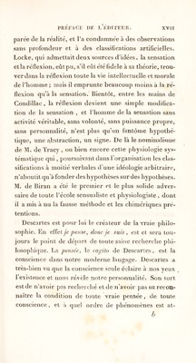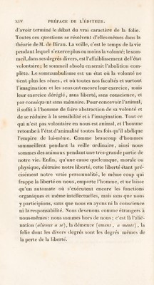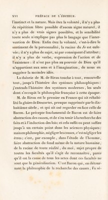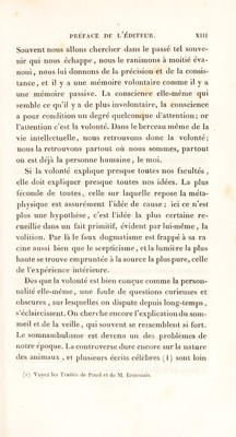 ![Souvent nous allons chercher dans le passé tel souve¬ nir qui nous échappe, nous le ranimons à moitié éva¬ noui, nous lui donnons de la précision et de la consis¬ tance, et il y a une mémoire volontaire comme il y a une mémoire passive. La conscience elle-même qui semble ce qu’il y a de plus involontaire, la conscience a pour condition un degré quelconque d’attention; or l’allention c’est la volonté. Dans le berceau même de la vie intellectuelle, nous retrouvons donc la volonté; nous la retrouvons partout où nous sommes, partout où est déjà la personne humaine, le moi. Si la volonté explique presque toutes nos facultés , elle doit expliquer presque toutes nos idées. La plus féconde de toutes, celle sur laquelle repose la méta¬ physique est assurément l’idée de cause ; ici ce n’est plus une hypothèse, c’est l’idée la plus certaine re¬ cueillie dans un fait primitif, évident par lui-même, la volition. Par là le faux dogmatisme est frappé à sa ra cine aussi bien que le scepticisme, et la lumière la plus haute se trouve empruntée à la source la plus pure, celle de l’expérience intérieure. Dès que la volonté est bien conçue comme la person¬ nalité elle-même, une foule de questions curieuses et obscures , sur lesquelles on dispute depuis long-temps , s’éclaircissent. On cherche encore l’explication du som¬ meil et de la veille , qui souvent se ressemblent si fort. Le somnambulisme est devenu un des problèmes de notre époque. La controverse dure encore sur la nature des animaux , et plusieurs écrits célèbres (^l) sont loin (i) Vojez les Traités de l'incl cl de ]\1. Rroiissais.](https://iiif.wellcomecollection.org/image/b29307879_0019.jp2/full/800%2C/0/default.jpg)