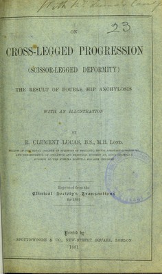 Credit: On cross-legged progression (scissor-legged deformity) the result of double hip anchylosis / by R. Clement Lucas. Source: Wellcome Collection.