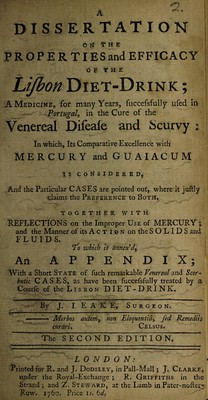 A dissertation on the properties and efficacy of the Lisbon diet-drink, a medicine. ... successfully used in Portugal, in the cure of the venereal disease and scurvy: in which, its comparative excellence with mercury and guaiacum is considered, and the particular cases are pointed out, where it justly claims the preference to both : Together with reflections on the improper use of mercury, and the manner of its actions on the solids and fluids To which is annex'd, an appendix, with a short state of such remarkable venereal and scorbutic cases, as have been successfully treated ... / by J. Leake.