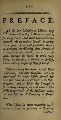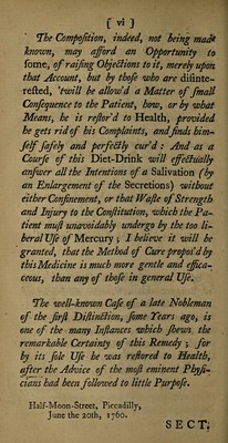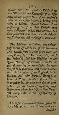 Credit: A dissertation on the properties and efficacy of the Lisbon diet-drink, a medicine. ... successfully used in Portugal, in the cure of the venereal disease and scurvy: in which, its comparative excellence with mercury and guaiacum is considered, and the particular cases are pointed out, where it justly claims the preference to both : Together with reflections on the improper use of mercury, and the manner of its actions on the solids and fluids To which is annex'd, an appendix, with a short state of such remarkable venereal and scorbutic cases, as have been successfully treated ... / by J. Leake. Source: Wellcome Collection.