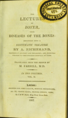 The lectures of Boyer, upon diseases of the bones / arranged into a systematic treatise by A. Richerand ; translated from the French by M. Farrell.